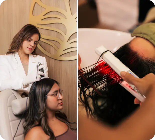 Todos os atendimentos são conduzidos por profissionais altamente qualificados e com protocolos adaptados à realidade de cada cliente — porque, para nós, cuidar dos cabelos é também cuidar da sua saúde, autoestima e bem-estar.